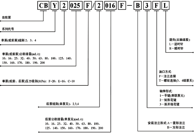 用途與特征: CBY型齒輪泵屬於高壓齒輪泵,是液壓係統的動力元件,它采用了高強度球度墨鐵殼體、承載能力高的DU軸承、浮動側板等結構,具有壓力高、轉速範圍寬、結構簡單、性能可靠、使用壽命長、並可組成多聯泵等特點。廣泛用於工程機械、礦山機械和起重運輸機械等液壓係統中。 型號說明: