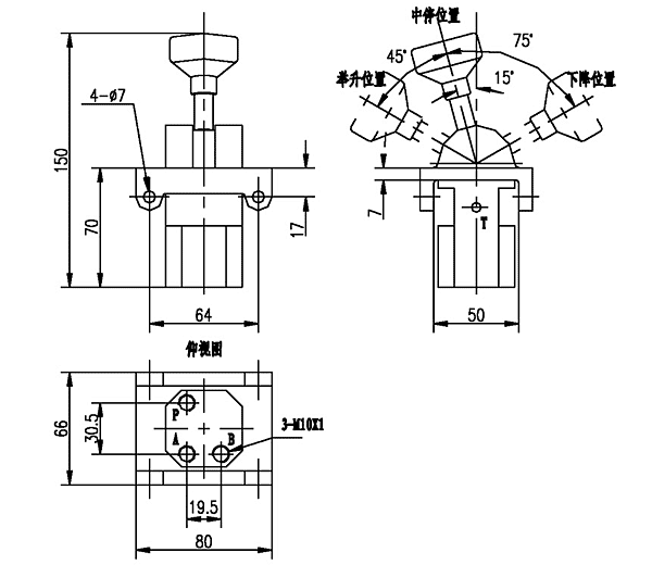 用途與特征: 我公司為載重自卸汽車開發的2KQF-W型操縱氣閥主要適用於載重汽車的自卸液壓係統,用於控製換向閥的動力氣源。 當手柄在“中停”位置時, P口關閉, A、B口不工作;當手柄在“舉升”位置時,P口與A口相通,B口不工作;當手柄在“下降”位置時,P口與B口相通,P口與A口相通,A口不工作。 圖形符號: