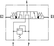 舉升、中停與下降:當自卸汽車需要舉升時,壓縮空氣通過控製氣閥進入舉升控製閥K1控製氣室,閥芯左移,壓力油通過舉升控製閥進入舉升缸下腔,車廂開始舉升;當控製氣閥關閉壓縮空氣時,閥芯回位,壓力油停止向舉升缸供油,車廂中停;當壓縮空氣通過控製氣閥進入舉升控製閥K2控製氣室,閥芯右移,車廂在重力作用下開始下降。該閥的工作原理示意圖如下: