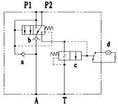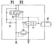 3.當轉向液壓係統助力泵出現故障或在行駛過程中發動機突然停止工作時,無轉向壓力油從P1口進入應急閥。這時應急閥主閥芯在彈簧力作用下複位,主閥芯和背壓閥c同時關閉;瞬間則由應急泵提供壓力油通過單向閥b(此時單向閥a關閉)分配到A口,壓力油經P2→b→A口流出進入液壓轉向器的分配閥使其正常工作,驅動液壓轉向器的活塞運動從而達到應急轉向的目的。