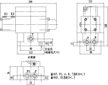QDZ9114型氣控閥組在中位時,P口與P1口相通,壓力油由P口進入,經過P1口可向其它機構提供油源。當壓縮空氣進入K1口或K2口時,該閥處於換向位置,壓力油由P口經過A口(或B口)進入油缸的一腔,油缸另一腔的油液由B口(或A口)經過T口回油箱,控製油缸的伸縮;當切斷進入該閥的壓縮空氣時,閥芯在彈簧力的作用下回到中位,雙向液控單向閥(液壓鎖)關閉,鎖定油缸的伸縮。該閥的工作原理示意圖如下: