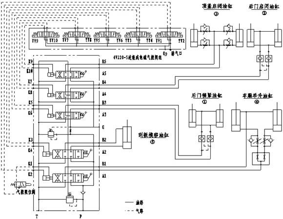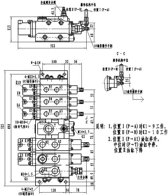 工作泵(舉升泵)供油進入QSF-L20H型組合換向閥後,通過氣控(手動)操作換向閥切換油路,實現對不同執行元件(油缸)的控製。當執行元件(油缸)需要大流量的液壓油進行工作時,用油管與該組合閥中進油閥體與分流閥體之間的換向閥體進行連接,工作泵(舉升泵)輸出的液壓油將全流量通過換向閥進入執行機構(油缸);當執行元件(油缸)需要小流量的液壓油進行工作時,用油管與該組合閥中分流閥體後麵的換向閥體進行連接,工作泵(舉升泵)輸入的液壓油經分流閥後分流出一部分(30L/Min)通過換向閥進入執行機構(油缸),剩餘的液壓油直接流回油箱。