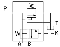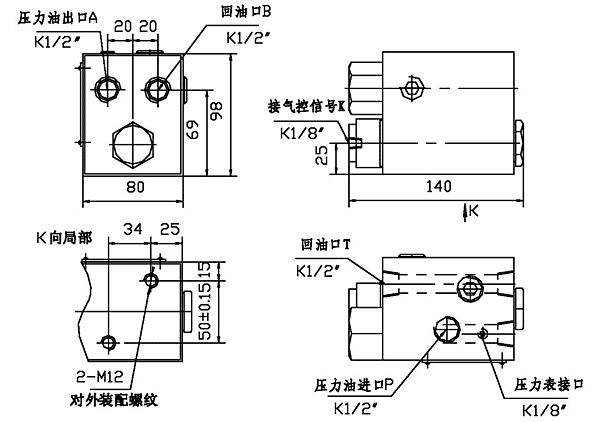 EQ340氣控分配閥是常開式二位四通換向閥與直動式溢流閥的複合。可用於一切有壓縮空氣源的工程機械、運輸機械等的液壓係統中,能可靠地控製工作油缸的舉升,有效地防止液壓係統過載,實現係統卸荷,起到安全、節能作用。有氣控信號時,二位四通換向閥換向,P與T斷開與A接通,係統在溢流閥限定壓下工作,溢流閥起安全作用。無氣控信號時,換向閥在彈簧作用下複位,P、A與T接通,係統卸荷。