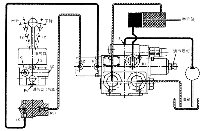 2KQF型操縱氣閥與QDF-L20F型氣控多路閥應用連接圖: