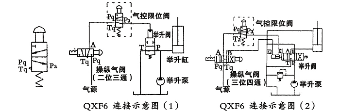 用途與特征: QXF6型(xing)氣(qi)控(kong)限(xian)位(wei)閥(fa)是(shi)二(er)位(wei)三(san)通(tong)型(xing)的(de)氣(qi)動(dong)元(yuan)件(jian),以(yi)壓(ya)縮(suo)空(kong)氣(qi)為(wei)工(gong)作(zuo)介(jie)質(zhi),在(zai)各(ge)種(zhong)自(zi)卸(xie)車(che)的(de)控(kong)製(zhi)氣(qi)路(lu)中(zhong)它(ta)與(yu)舉(ju)升(sheng)閥(fa)的(de)控(kong)製(zhi)氣(qi)缸(gang)管(guan)路(lu)串(chuan)接(jie)在(zai)一(yi)起(qi)使(shi)用(yong),是(shi)自(zi)卸(xie)車(che)舉(ju)升(sheng)至(zhi)極(ji)限(xian)位(wei)置(zhi)時(shi)起(qi)限(xian)位(wei)作(zuo)用(yong)控(kong)製(zhi)閥(fa)。 QXF6型氣控限位閥的原始位置Pq口與Pa口是連通的(常開式結構)。在連接示意圖(1)中搬動操縱氣閥的手柄換向至工作位置(Pq口與A口連通)將(jiang)壓(ya)縮(suo)空(kong)氣(qi)經(jing)氣(qi)控(kong)限(xian)位(wei)閥(fa)進(jin)入(ru)舉(ju)升(sheng)閥(fa)氣(qi)缸(gang)使(shi)舉(ju)升(sheng)閥(fa)換(huan)向(xiang)實(shi)現(xian)液(ye)壓(ya)缸(gang)上(shang)升(sheng)。當(dang)車(che)廂(xiang)舉(ju)升(sheng)到(dao)最(zui)大(da)轉(zhuan)角(jiao)位(wei)置(zhi)時(shi),限(xian)位(wei)機(ji)構(gou)將(jiang)氣(qi)控(kong)限(xian)位(wei)閥(fa)的(de)限(xian)位(wei)杆(gan)壓(ya)下(xia)切(qie)斷(duan)其(qi)進(jin)氣(qi)口(kou)(Pq口與Pa口是斷開),Pa口與Tq口接通使舉升閥氣缸內的壓縮空氣由氣控限位閥排入大氣。這時舉升閥P口與T口瞬間連通,舉升缸即下降一段距離(車廂舉升轉角變小),隨車廂舉升轉角變小氣控限位閥的限位杆恢複原始狀態同時壓縮空氣經該閥再次進入舉升閥氣缸使舉升缸,上升(車廂再次舉升到最大轉角位置)。 在氣控限位閥的限位杆行程範圍內(即Pa口的閉合開啟閉合)實現車廂下降舉升下降往複變化過程,使車廂產生輕微抖動有利於將車廂內的殘留物體卸掉。在連接示意圖(2)中搬動操縱氣閥的手柄換向至工作位置(Pq口與A口連通)將壓縮空氣經氣控限位閥進入舉升閥的氣缸K1口實現液壓缸上升。當車廂舉升到最大轉角位置時,限位機構將氣控限位閥的限位杆壓下切斷其進氣口(Pq口與Pa口是斷開),Pa口與Tq口接通使舉升閥氣缸內的壓縮空氣由氣控限位閥排入大氣。這時舉升閥回到中位,P口經B口與T口連通回油,A口關閉車廂處於最高舉升位置狀態。