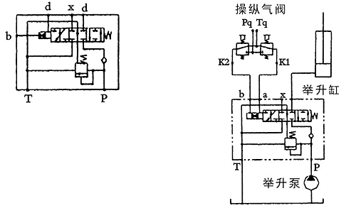 用途與特征: QZS-L15(20)型(xing)氣(qi)控(kong)換(huan)向(xiang)閥(fa)是(shi)我(wo)公(gong)司(si)最(zui)新(xin)研(yan)製(zhi)的(de)由(you)氣(qi)源(yuan)控(kong)製(zhi)的(de)換(huan)向(xiang)閥(fa)。通(tong)過(guo)氣(qi)缸(gang)作(zuo)先(xian)導(dao)控(kong)製(zhi),推(tui)動(dong)閥(fa)芯(xin)的(de)開(kai)閉(bi)而(er)轉(zhuan)換(huan)工(gong)作(zuo)機(ji)能(neng)。在(zai)液(ye)壓(ya)係(xi)統(tong)中(zhong)起(qi)到(dao)接(jie)通(tong)或(huo)卸(xie)荷(he)作(zuo)用(yong),即(ji)實(shi)現(xian)各(ge)大(da)型(xing)自(zi)卸(xie)車(che)執(zhi)行(xing)元(yuan)件(jian)舉(ju)升(sheng)中(zhong)停(ting)下(xia)降(jiang)功(gong)能(neng)。當(dang)氣(qi)控(kong)口(kou)a接通氣源,推動氣控換向閥的閥芯至舉升位置使車廂舉升。當氣控口b接(jie)通(tong)氣(qi)源(yuan),推(tui)動(dong)氣(qi)控(kong)換(huan)向(xiang)閥(fa)的(de)閥(fa)芯(xin)至(zhi)下(xia)降(jiang)位(wei)置(zhi)使(shi)車(che)廂(xiang)舉(ju)升(sheng)下(xia)降(jiang),同(tong)時(shi)泵(beng)卸(xie)荷(he)。當(dang)氣(qi)控(kong)口(kou)不(bu)通(tong)氣(qi)源(yuan),氣(qi)控(kong)換(huan)向(xiang)閥(fa)的(de)閥(fa)芯(xin)在(zai)彈(dan)簧(huang)力(li)的(de)作(zuo)用(yong)下(xia)回(hui)到(dao)中(zhong)間(jian)位(wei)置(zhi)使(shi)車(che)廂(xiang)舉(ju)升(sheng)位(wei)置(zhi)保(bao)持(chi)不(bu)變(bian),同(tong)時(shi)泵(beng)卸(xie)荷(he)。 圖形符號: