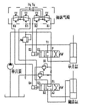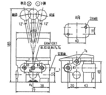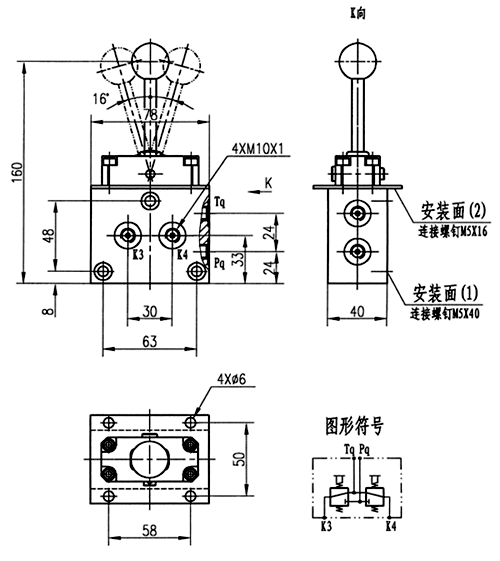 4(2)KQF型操縱氣閥的原始位置Pq口與T口是封閉的,各控製口K與TQ口相通。搬動手柄可在四個或二個不同角度。該閥的工作原理示意圖如下