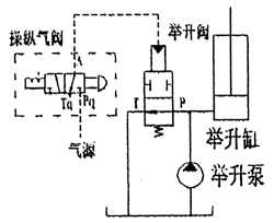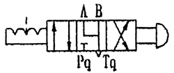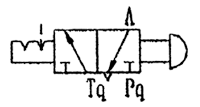 KQF23型操縱氣閥的原始位置Pq口與Tq口是封閉的,A口與Tq口相通。當把操縱氣閥的手柄拉出後,Pq口與A口連通去控製舉升閥氣缸,使液壓係統進入工作狀態。當把操縱氣閥的手柄推入後,切斷Pq口與A口的通路,舉升閥氣缸內壓縮空氣由該閥排入大氣,使液壓係統卸荷。該閥的工作原理示意圖如下A。
