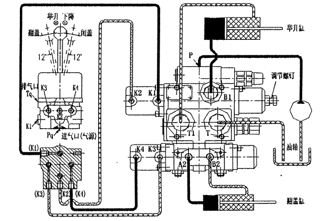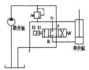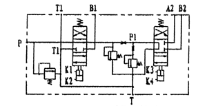 當氣控多路閥處於中間位置時,使車廂舉升位置保持不變,同時係統壓力油供另一組帶附加功能(翻蓋功能)的閥片工作即可實現車廂翻蓋的閉合―展開功能。該閥的工作原理示意圖如下