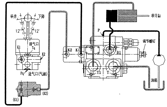 該閥先導控製部分以壓縮空氣為工作介質,通過氣缸動作推動閥芯開閉而轉換工作機能,即實現車廂的舉升―中停―下降等功能。