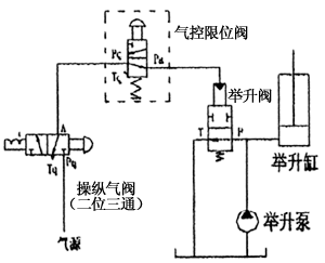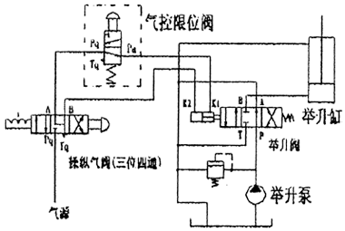 在氣控限位閥的限位杆行程範圍內(即Pa口的閉合―開啟―閉合)實現車廂下降―舉升―下降往複變化過程,使車廂產生輕微抖動有利於將車廂內的殘留物體卸掉。在連接示意圖(2)中搬動操縱氣閥的手柄換向至工作位置(Pq口與A口連通)將壓縮空氣經氣控限位閥進入舉升閥的氣缸K1口實現液壓缸上升。當車廂舉升到最大轉角位置時,限位機構將氣控限位閥的限位杆壓下切斷其進氣口(Pq口與Pa口是斷開),Pa口與Tq口接通使舉升閥氣缸內的壓縮空氣由氣控限位閥排入大氣。這時舉升閥回到中位,P口經A口與T口連通回油,B口關閉車廂處於最高舉升位置狀態,該閥的工作原理示意圖如下。