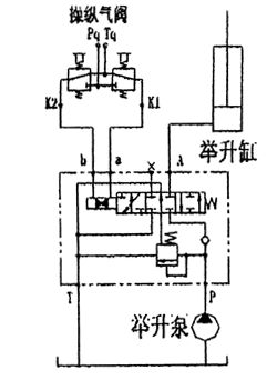 當氣控口a接通氣源,推動氣控換向閥的閥芯至舉升位置使車廂舉升。