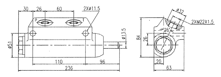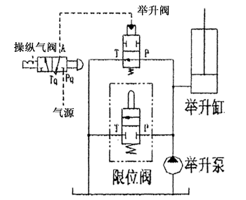 當車廂舉升轉角達到一定角度時,舉升缸或其它限位機具觸及限位閥閥杆,閥內P口與Tkoujietongxitongxiehe,qieduanxiangjushengganggongyou,chexiangtingzhijusheng,shixianxianweigongnengqijushengxianweizuoxianyong。dangchexiangjushengdaozuidazhuanjiaoweizhishi,xianweijigoujiangxianweifadexianweiganyaxiaP口與T口接通,使舉升缸供油口與T口瞬間連通,舉升缸即下降一段距離(車廂舉升轉角變小),隨車廂舉升轉角變小限位閥的限位杆恢複原始狀態同時係統壓力油再次進入舉升缸使其上升(車廂再次舉升到最大轉角位置)。在限位閥的限位杆行程範圍內(即P口的開啟―閉合―開啟)現車廂下降―舉升―下降往複變化過程,使車廂產生輕微抖動有利於將車廂內的殘留物體卸掉。該閥的工作原理示意圖如下。